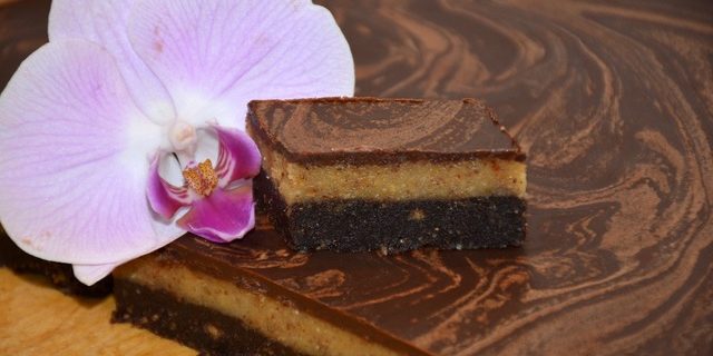 Kupljene mlete lešnike fino zmeljemo v kavnem mlinčku. V vodi stopimo maslo (navadno in kokosovo) in med. Maso iz lešnikov razdelimo na polovico in eni polovici dodamo 50 g kakava, da dobimo temno maso. Stopljeno maslo z medom zlijemo polovico v svetlo maso in polovico v temno maso ter dobro premešamo, da dobimo gladko maso ter da se mleti lešniki ne sprimejo v grudice. Na peki papir razporedimo svetlo maso in nanjo še temno maso z dodanim kakavom. Po vrhu prelijemo s stopljeno temno čokolado in damo v hladilnik, najbolje čez noč, da se bajadera dobro ohladi. Hladno narežemo na kockice ter postrežemo.